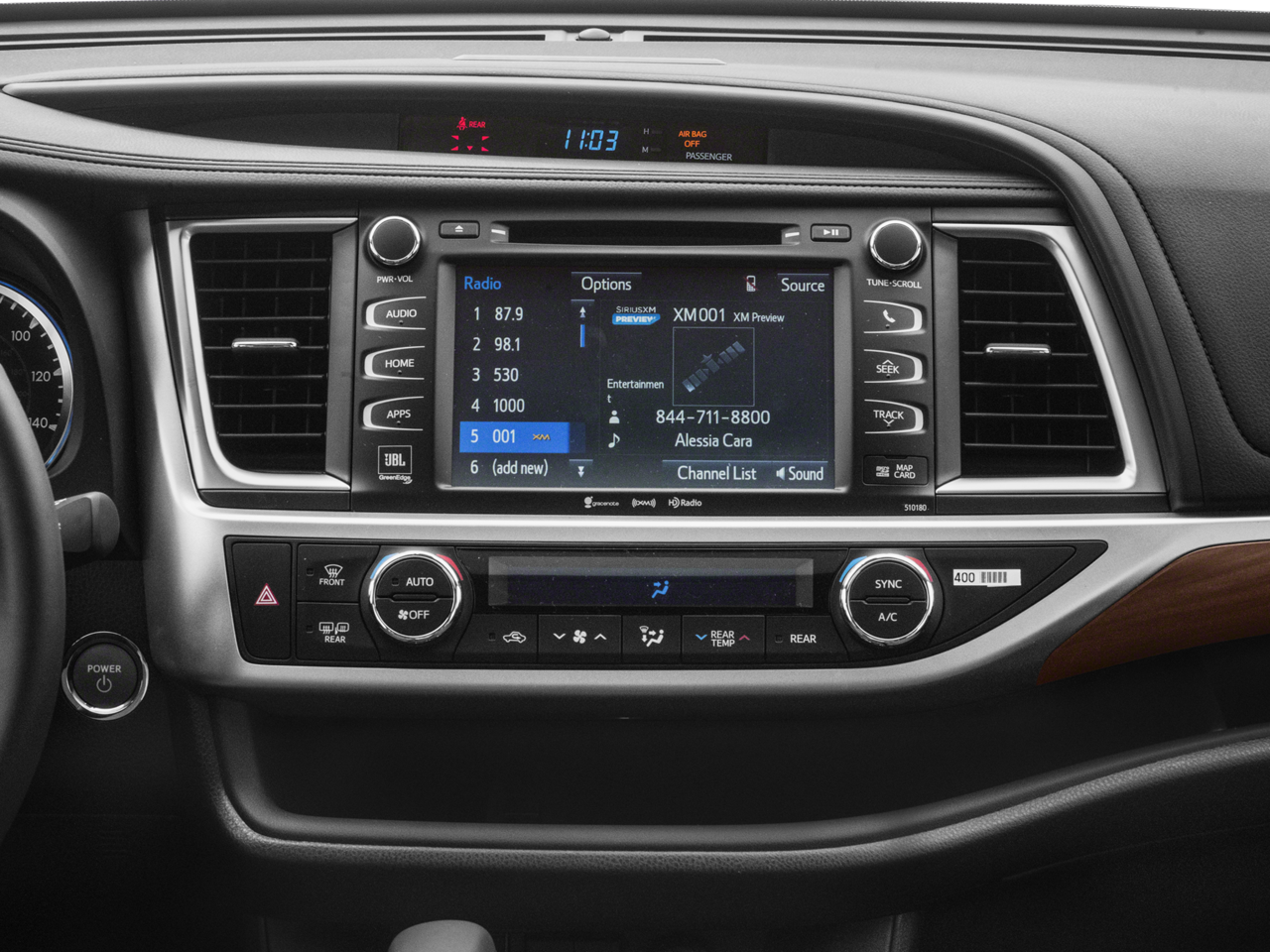 - Radio: Entune Premium JBL Audio w/Nav & App Suite -inc: the Entune Multimedia Bundle (8" high resolution touch-screen w/split screen display, AM/FM CD player, MP3/WMA playback capability, 12 JBL GreenEdge speakers, auxiliary audio jack, USB 2.0 port w/iPod connectivity and control, advanced voice recognition, hands-free phone capability, phone book access and music streaming via Bluetooth® wireless technology), Siri Eyes Free, Entune App Suite, Intelligent Touch controls, SiriusXM Satellite Radio w/3-month complimentary SiriusXM All Access trial, HD Radio, HD Radio predictive traffic and Doppler weather overlay, AM/FM cache radio, Gracenotes album cover art and integrated backup camera display w/dynamic gridlines